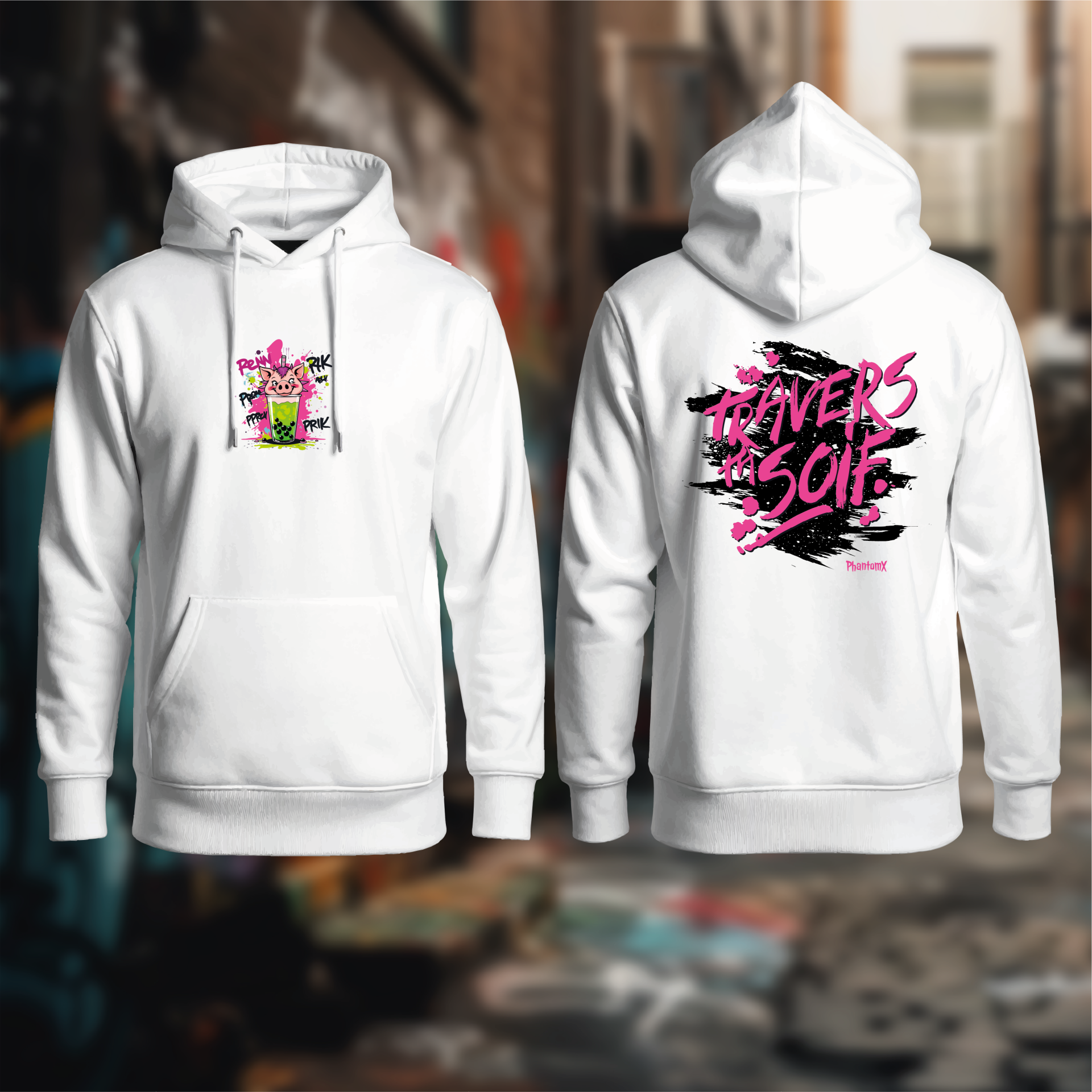 Plonge dans l’univers déjanté de PhantomX avec ce design unique : un cochon punk espiègle, de style underground, qui se prélasse dans un bubble tea géant. Derrière lui, l’inscription audacieuse Travers ta soif te rappelle de vivre tes envies sans compromis. Un mélange de rebellion et de gourmandise, parfait pour ceux qui aiment porter leur personnalité partout.